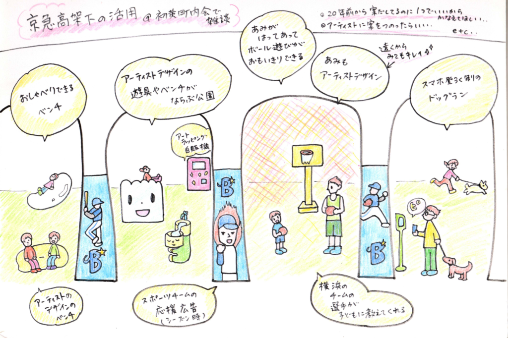 まずは京急電鉄の担当者の方とともに、高架下の活用法について各町内会でヒアリングし、意見を1枚の絵にまとめました。全員から出た意見をイラスト化することで、できるだけ多くの方の声を拾いつつイメージしやすくしました。この絵をもとにワークショップで議論を重ねた結果、高架下の公園化というアイデアの実現につながっています。