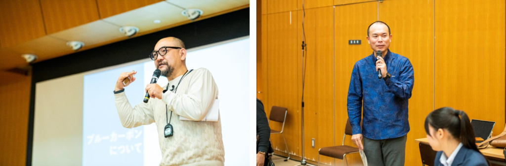 さらに株式会社DMC沖縄の客員研究員である岩村俊平さんが、ワークショップ サステナビリティ専門員として参加。キャリアコンサルタント、技術士(建設・水産)、潜水士として活躍していて、ブルーカーボンやSDGsの専門家でもあります。各グループを巡回してディスカッションをサポートしてくれました。